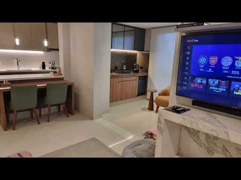 • Sala de estar: ar-condicionado K7, TV LED 60”, sofá reclinável, painel planejado, sistema de som JBL Soundbar com subwoofer, cortinas sob medida, mesa para lanches e lareira ecológica em granito.